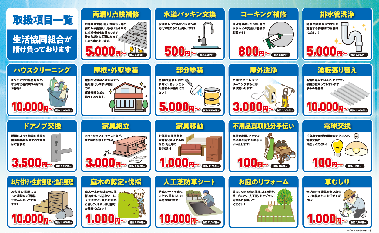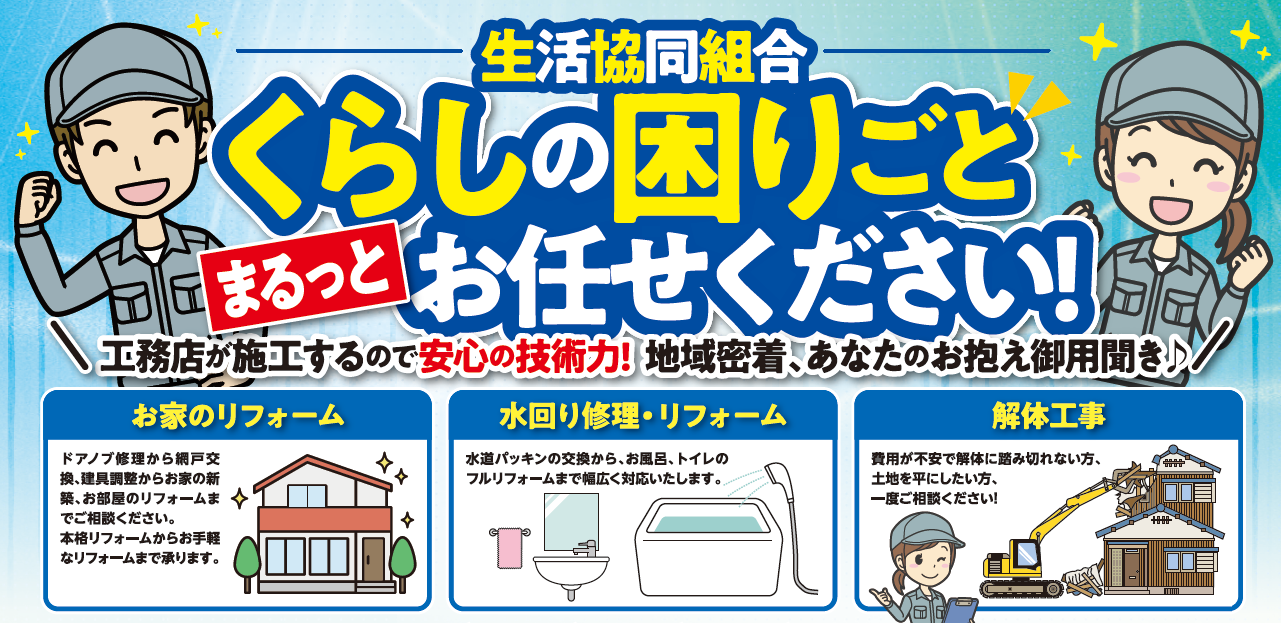 地域密着、あなたのお抱え御用聞き 住宅に関するお困りごと どこに相談や依頼をしたら良いか わからないこと、たくさんありませんか? お困りごとなんでも当社にお任せください! 安心の技術力 現地調査から見積・施工・確認まで工務店のプロが行います。安心してお任せください! なんでも受け付けます 当社のサービスにないお困りごとでもご相談受付します。お悩みはお気軽にご相談ください なんでも受け付けます 当社のサービスにないお困りごとでもご相談受付します。お悩みはお気軽にご相談ください お見積・出張料金無料! 当社はご相談後の出張料金やお見積は無料です。余計な代金は一切いただきません!
